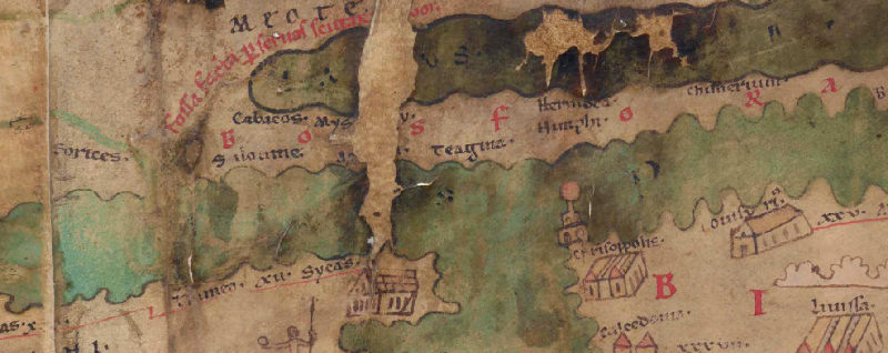 Die drei noch erkennbaren Buchstaben sind wohl zu ergänzen zu Acria. Talbert zieht im BAtlas meines Erachtens fälschlicherweise zwei Ortsnamen zu einem einzigen Toponym zusammen, führt sie dann aber in der Datenbank getrennt auf. Die Welser-Edition (1598) bietet hier zwei verschiedene Ortsnamen - Mysary und Acria. Scheyb liest Mys[...]y und Ac[...], von letzterem Toponym zeigt er noch Reste des Schlussbuchstabens. Beide Ortsnamen sind durch einen Riss im Pergament teilweise nicht mehr lesbar. |