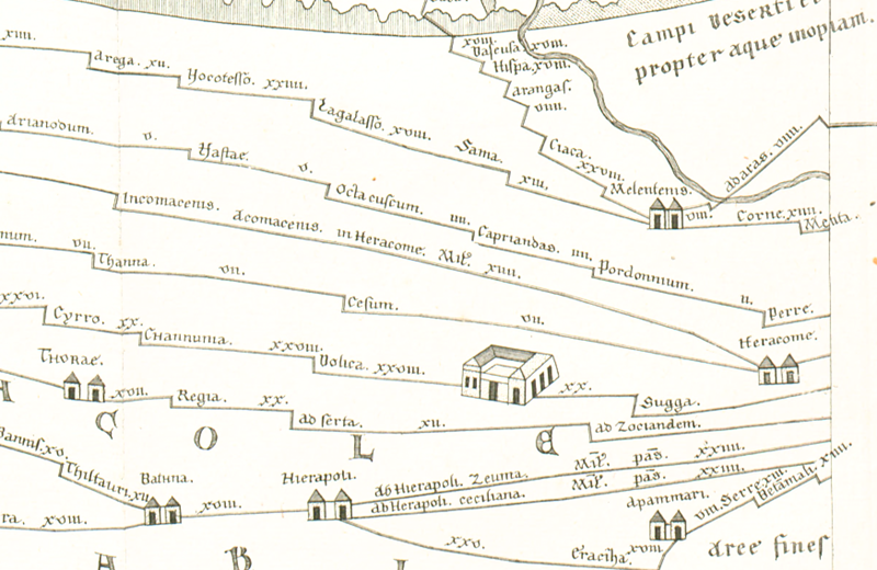 | Kommentar zum Toponym: | Typischer Eintrag aus einem Itinerar, der hier, wie auch an einigen andereren Stellen auf der TP, wohl ausgeschrieben wurde, um die lange leere Strecke von 10B1 Incomacenis (s. Artikel dort) nach 10B2 Heracome zu überbrücken. |
