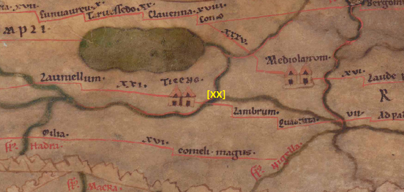 | Itinerario: | Ticino (283,1), Ticinum (340,1; 347,1; 356,8), civitas Ticino (557,8) |