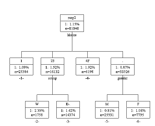 CHAID untersucht nun, welche der betrachteten Variablen bei einem Chi-Quadrat-Unabhängigkeitstest mit der Zielvariablen das höchste Signifikanzniveau besitzt. Dies ist hier die Variable hhsize, bei der noch zu einem Signifikanzniveau von 4,4 * 10**(-14) die Unabhängigkeitshypothese verworfen würde. Da die Haushaltsgrößen 2 und 3 Personen sowie 4 und 5 und mehr Personen sich jeweils nicht signifikant voneinander unterscheiden, werden diese Ausprägungen aggregiert. Somit ergeben sich vier Subgruppen, die nun weiter untersucht werden. In den Subgruppen mit Haushaltsgröße 1 sowie Haushaltsgröße 4, 5 und mehr können keine weiteren Variablen gefunden werden, bei denen sich zum Signifikanzniveau 0,05 die Unabhängigkeitshypothese verwerfen läßt. Bei den 2- und 3-Personen-Haushalten sind die Variablen occup und resp2, bei den Haushalten ohne Angaben zur Haushaltsgröße gender und die Zielvariable statistisch signifikant abhängig. Da jeweils keine weiteren Untergruppen mehr gefunden werden können, läßt sich die Grundgesamtheit sinnvoll in 6 Segmente zerlegen. Das Ergebnis wird im folgenden Baumdiagramm dargestellt, das auch die Quote der jeweils positiven Reaktionen beinhaltet.